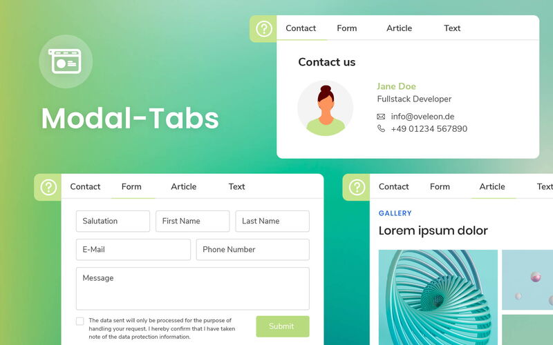 Das Produkt "Modal Tabs" erlaubt die Konfiguration eines aufklappbaren Störers mit vielfältigen Inhalten. Perfekt für Texte, Formulare, Bilder und mehr.